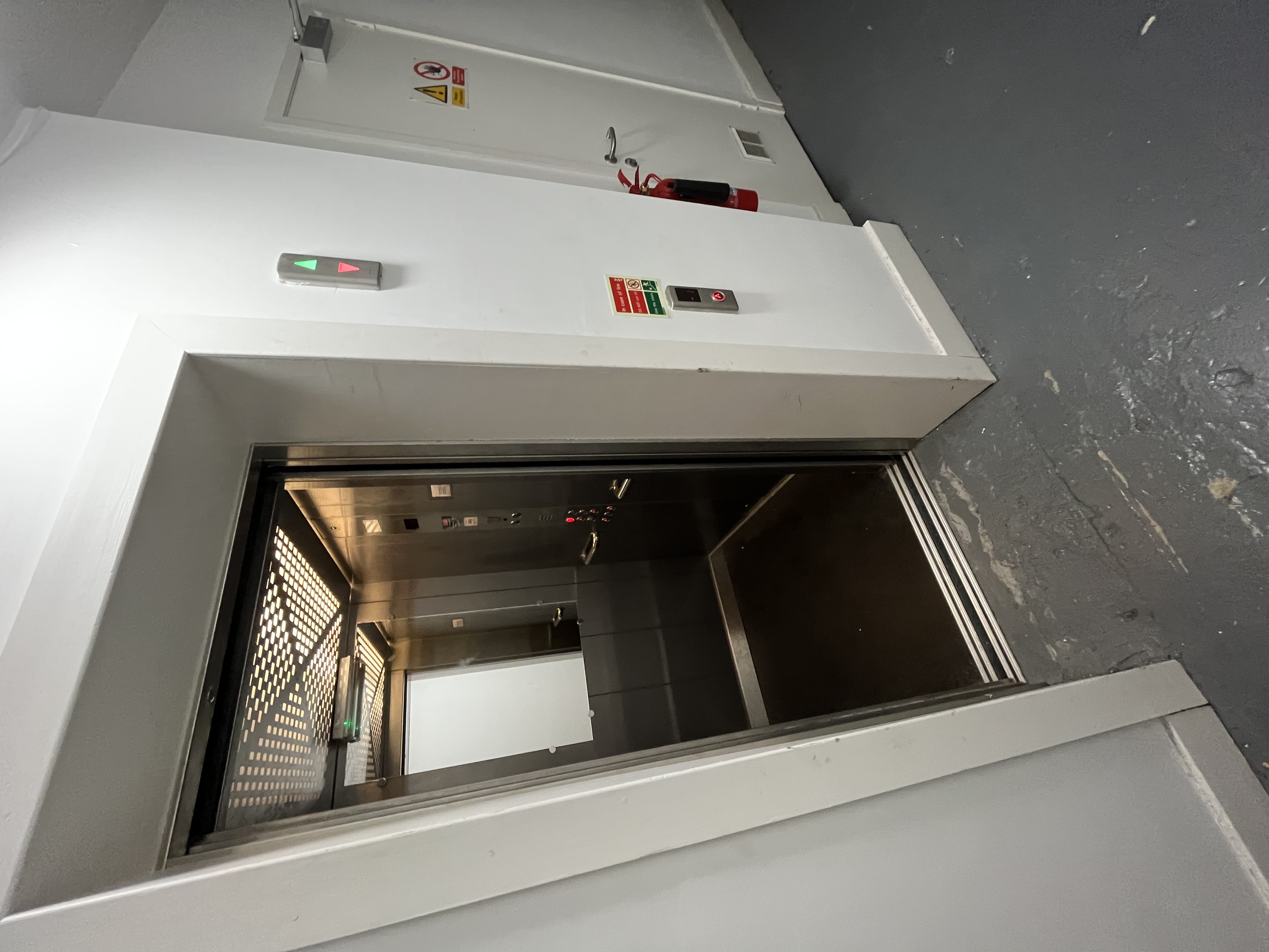 The delivery point for deliveries to the office is via the rear door, along a flat surface with ramps to a lift. To get to the lift it is necessary to pass through a fire door with a width of 90 centimeters. The lift is rated for 630 kg and has a door width of 80 centimeters, and a depth of 1.4 meters.